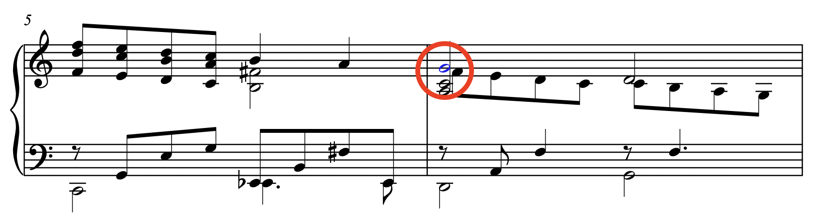 1. cresc. 또는 decresc. 헤어라인을 넣을 자리의 마디나 음을 한 개 선택합니다. 아래 그림에서는 파란색으로 선택되었습니다.