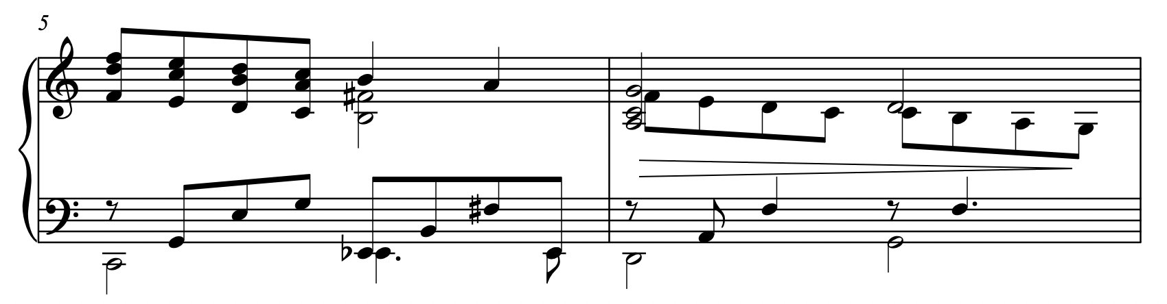 아래 악보를 보면 마디6에 decresc. 헤어라인과 rall. 기호가 겹쳐있고 겹친 부분의 헤어라인이 지워져 있는 것을 볼 수 있습니다.