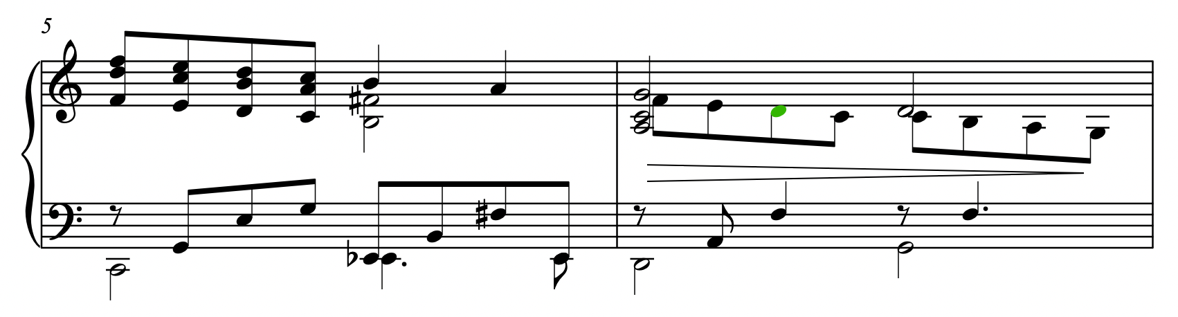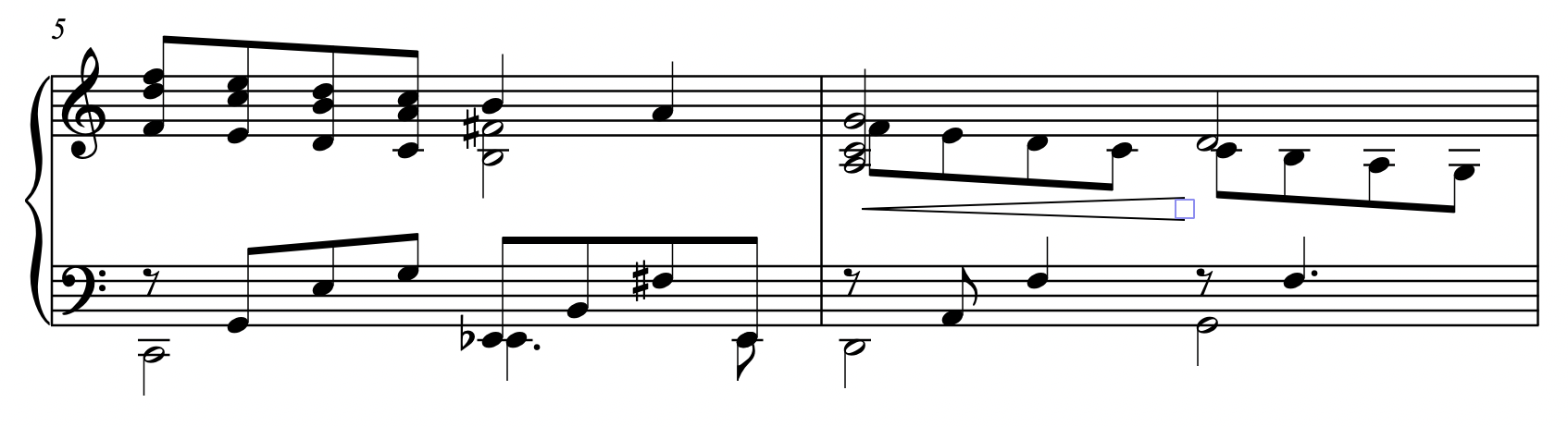 2. 컴퓨터 자판에서 H 를 누르면 cresc. 헤어라인이 만들어집니다. 이 때 Spacebar를 누를 때 마다 헤어라인이 오른쪽 방향으로 연장됩니다. 원하는 위치에 닿을 때까지 Spacebar를 누르면 됩니다. 이 악보에서는 voice1에 그려있는 2분음표를 선택했기 때문에 cresc. 헤어라인이 2분음표 길이로 그려졌습니다. 만일 voice2에 있는 8분음표(F음)을 선택하고 H 를 눌렀다면 첫 길이가 8분음표 길이로 설정됩니다.
