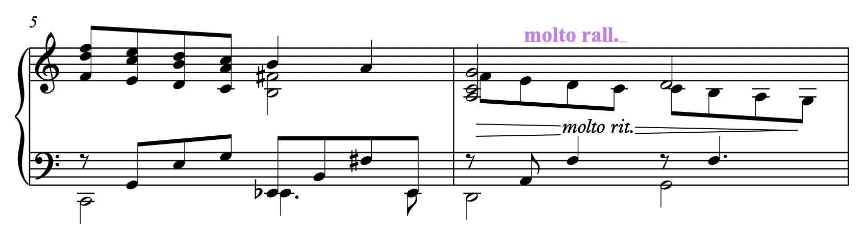 5. 커서가 깜박이면 molto rit. 라고 써줍니다. 입력이 완료되면 악보의 빈곳을 클릭하거나 Esc.키를 (여러번) 눌러 그 모드에서 빠져나옵니다. 그럼 아래와 같이 molto rit. 글자 뒤에 있는 헤어라인이 지워져서 깔끔한 악보가 되었습니다.